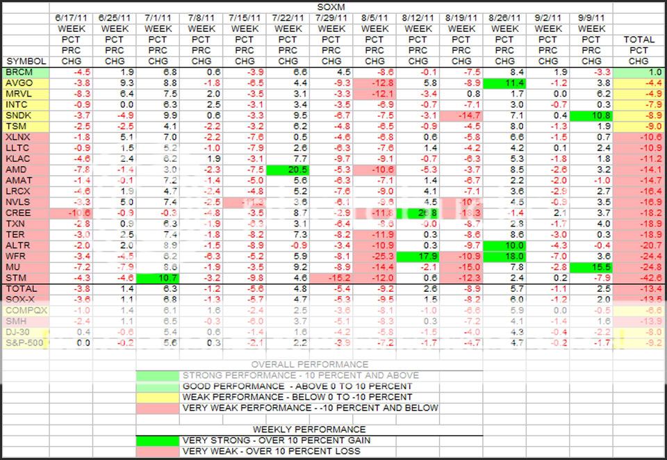 This is the weekly update of the 13 week rolling quarter for the SOXM stocks in terms of percent change.