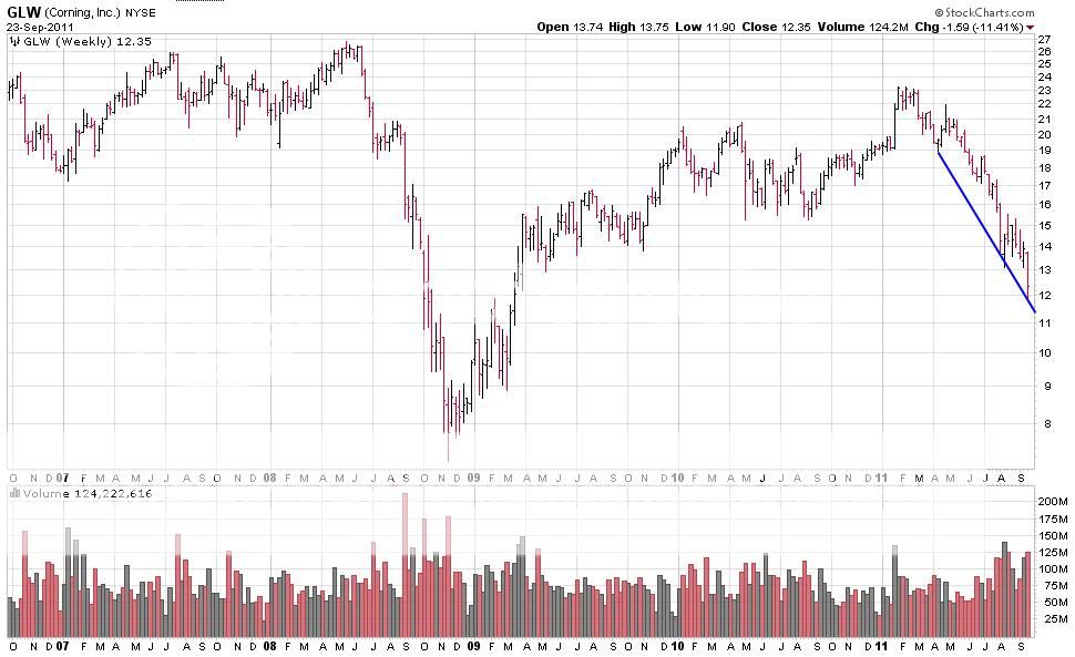 Judging from GLW's recent price/volume pattern and the fact of its improved balanced sheet since the last cyclical low, the $11-$12 dollar range should be a good entry point for value investors.