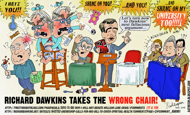 "Craig is not a skilled debater. His style is tediously to drag out pompous syllogisms, which his opponents ignore because they are irrelevant, and which his disciples cannot understand: the combination of incomprehension plus his loud voice makes them think he has ‘won’ the debate, and this impression is reinforced by the fact that he always declares that he has ‘won’ whether he has or not. If anybody does succumb to his incessant badgering for debate (he seems to have nothing else to do with his time), the best technique would probably be to agree to debate him on the question of biblical morality, and then quote his own words at him, on the subject of the genocide of the Canaanites:" (Richard Dawkins, Pharyngula; comment 17) So, no response to the arguments. Still the same tantrums, whining and insults from the sidelines that he's resorted to in the past. Dawkins evidently suffers from "Basil Fawlty" syndrome: a complete failure to self-reflect on one's own psychology and actions. How can he not realize such comments merely imply that he's compensating, for feeling too dumb to handle Craig's rebuttal of his "unrebuttable" book?