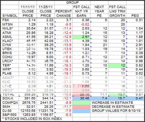 AMAT and KLIC are side by side, down 20.2 and 21.2 percent. It is hard to see how KLIC has much downside left with a present PE of 5. Two weeks ago the PE was 7. AMAT has a PE of 9, two weeks ago it was 13.