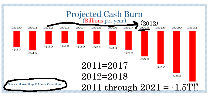 The 2011 numbers for SSA indicate that we are at least five years ahead of existing thinking on the SSA deficits. When this realization sinks in, it will break the hearts of the SS defenders. If we are, as I contend, five to six years ahead of “schedule” with cash deficits at SSA, there is no alternative besides cutting scheduled benefits. Raising taxes to fill a hole this big is not an option. Nor is it an option to maintain the status quo and allow for a very rapid rundown of the SS Trust Fund.