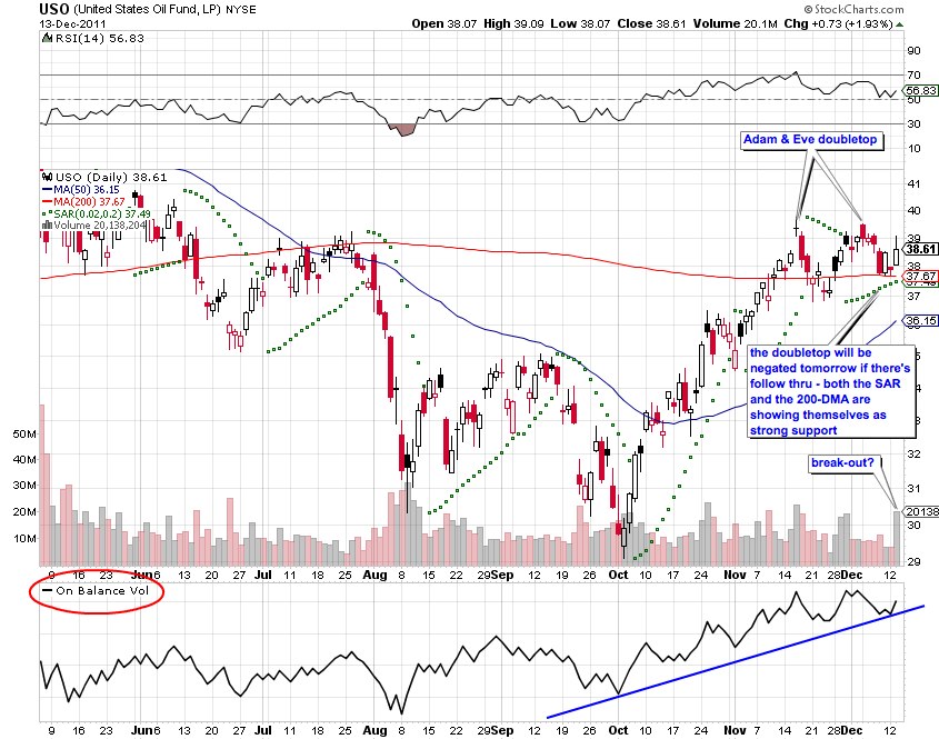 USO: this is probably the trickiest thing to trade-- we could get follow through tomorrow, but if peace breaks out, we the traders get killed? You would think that the markets would rally on peace, swords into plowshares...good news should take oil up with it? But if the US economy is a defence contractor's dream, then what?