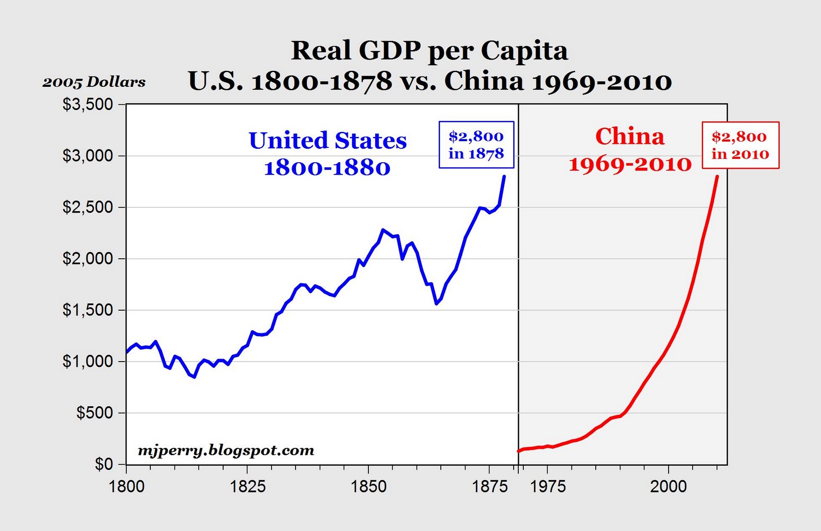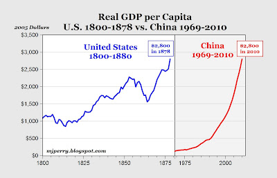 2. Even though China is now the world largest manufacturer, its GDP per capita of only $2,800 (data here from the USDA) is just now reaching a level of output per person that the U.S. achieved back in 1878, 133 years ago (see chart below).
