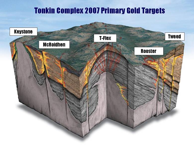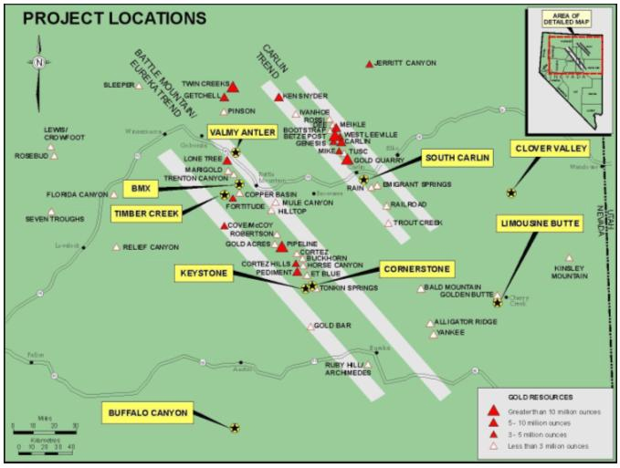 Properties acquired with Nevada Pacific Gold: Keystone Gold Project - It comprises 338 claims, some 6,760 acres. This project lies just 12 miles south and along strike of the northwest-trending corridor of gold deposits at the Cortez Joint Venture. (The property includes base and precious metal mineralization that occurs along the edge of the Keystone window in both upper and lower plate rock, near the northern contact of a 33.4 Ma granodiorite stock. Historic drilling shows indications of Carlin-style gold mineralization with assays up to 4.3 g/t gold in lower-plate jasperoids.) Limousine Butte Project - Comprises 423 claims, some 8,460 acres. It is located in White Pine County, Nevada, approximately 20 miles due east of Placer Dome's Bald Mountain mine. BMX Project, which lies within the Battle Mountain Copper/Gold district in northeastern Nevada. South Carlin project Cornerstone property Magistral Gold Mine in Mexico El Gallo Along with about 500,000 acres of mineral rights in Mexico's Sinaloa State. Map of Nevada Pacific properties in Nevada.  Properties acquired from BacTech: Tonkin Springs Property - Gold's Tonkin Springs gold mine encompasses 36 square miles located on the prolific Cortez Gold Trend in Nevada. A gold resource of 1,400,000 ounces has been defined at the mine and, in addition, facilities which include a 2,000 ton per day mill with a bioleaching circuit and complete mine, mill and tailings infrastructure.