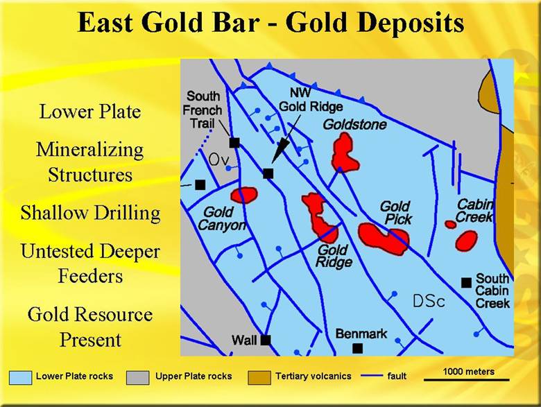 Gold Bar Project alone includes the following Claims: Benmark Claims 100 Sq Mi 2.53 White Knight Celt - Claims 608 Sq Mi 19.64 White Knight Cottonwood Claims 216 Sq Mi 6.09 White Knight Gold Bar Horst Claims 183 Sq Mi 5.71 White Knight Gold Pick Claims 27 Sq Mi .94 White Knight Goldstone Claims 62 Sq Mi 1.86 White Knight Hunter Claims 48 Sq Mi 1.74 White Knight McClusky Pass Claims 243 Sq Mi 7.83 White Knight South Cabin Creek Claims 84 Sq Mi 2.71 White Knight Tonkin Summit Claims 186 Sq Mi 5.98 White Knight Gold Bar North Claims 19 Sq Mi .60 Tone Kobeh Claims 133 Sq Mi 4.10 Tone Roberts Creek Claims 54 Sq Mi 1.70 Tone Total Claims 1,963 Total Sq Mi 61.43