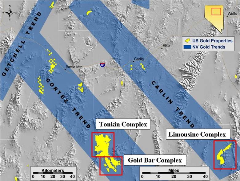 Properties acquired with White Knight : Celt property - covering 12,569 acres located in Eureka County Cottonwood property - consists of 2,178 acres situated within the Roberts Mountains district. Fye Canyon property - covering 6,320 acres situated 11 miles south-southeast of the recently discovered Cortez Hills gold deposit in Nevada. Gold Bar Horst property - comprising 3,652 acres located approximately 30 miles northwest of Eureka. Gold Pick property - covering 601 acres located in the Gold Bar Mine District, 30 miles northwest of Eureka. Patty property located 15 miles southeast of the Cortez Window. McClusky Pass property in Nevada Own interests in the New Pass property totaling 2,231 acres located 27 miles west of Austin, Nevada. Slaven Canyon property consists of 6,587 acres located in the northern Shoshone Range, Lander County. Squaw Creek property located 42 miles north due north of Battle Mountain, Nevada.