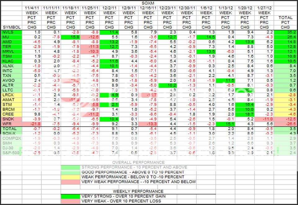 This is the weekly update of the 13 week rolling quarter for the SOXM stocks in terms of percent change.