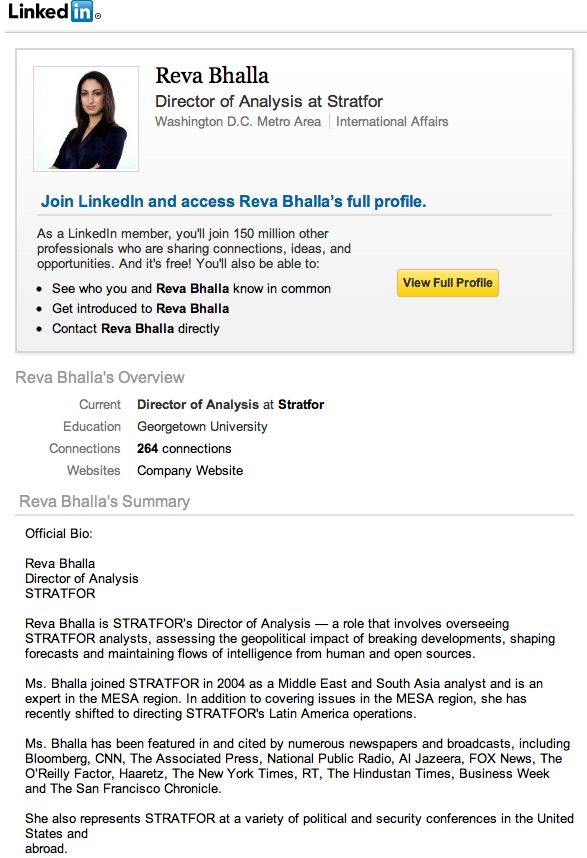 WikiLeaks has done it again. They have released the first of 5 million emails from Stratfor or Strategic Forecasting, a corporate intelligence company. Back in December 2011, Anonymous hackers announced that they had gathered more than 200 gigabytes of data from Stratfor's poorly secured database. Thus far, in typical Wikileaks fashion, only 214 emails have been released, among them, this gem between Reva Bhalla and George Friedman.
