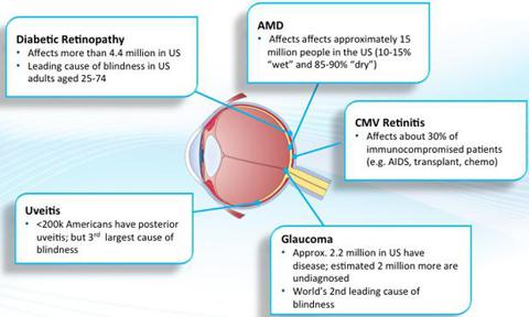 In addition to DME, diseases of the back of the eye include age-related macular degeneration (AMD), glaucoma, uveitis and cytomegalovirus retinitis (CMV retinitis). More than 20 million Americans suffer from back-of-the-eye diseases.