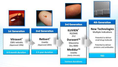 Its Vitrasert implant was approved in 1996 for CMV retinitis, which affects about 30% of patients with a compromised immune system. It was followed in 2005 by the Retisert implant to treat uveitis. Both products are distributed by Bausch & Lomb. pSivida's big breakthrough came with the development of three tiny bio-erodible implants: ILUVIEN, Durasert and Medidur.