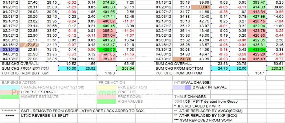 This is the weekly update of the Group and SOXM(SOX) tables in terms of earnings estimates and price changes.