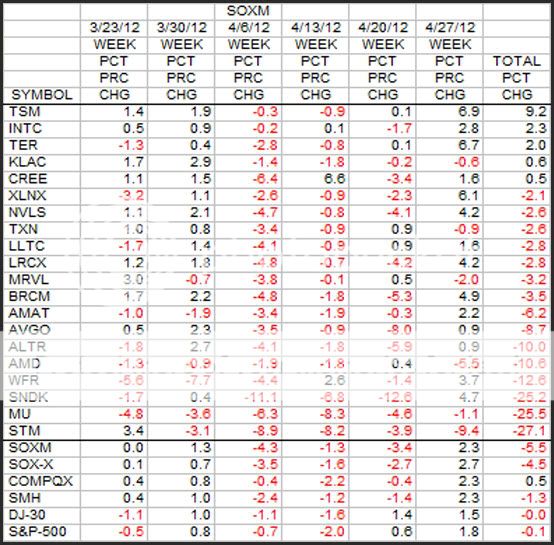 Here the picture is quite a bit different from the Group stocks. Most of the individual stocks are down with the SOXM being down 5.5 percent for the period. Only the COMPQX is up by 0.5 percent. The DOW and S&P-500 finished almost even for the 6 weeks.