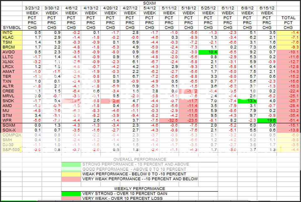 This is the weekly update of the 13 week rolling quarter for the SOXM stocks in terms of percent change.