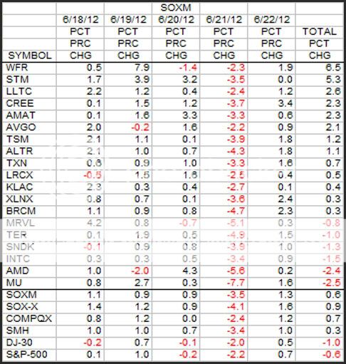 At the bottom line the week looked good with the exception of Thursday which was a "killer". The SOXM, SOX and NASDAQ were up four days, but down big on Thursday.