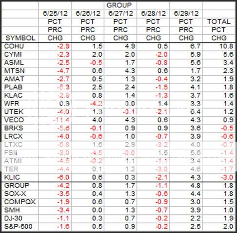 Today, Friday, was a rip-roaring day of market movement to the upside. Something about the Europe situation getting better supposedly was the catalyst for this action. It turned a negative week into a quite respectful positive week. All indices at the bottom line closed in positive territory. COHU was "flying" for the last 4 days of the week and finished in top spot with a 10.8 percent gain.