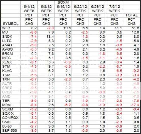 This is a longer 6 week look at the SOXM stocks in terms of percent change.