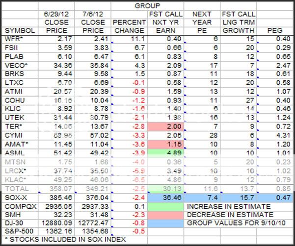 KLAC and LRCX wound up on the bottom this week, down 6.5 and 5.9 percent. WFR continues its recovery from a giant selloff recently to gain 11.1 percent for the week to wind up in top spot.