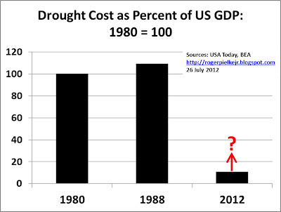 Comparing 2012 Drought Costs to 1980 and 1988 by noreply@blogger.com (Roger Pielke, Jr.)  USA Today reports some estimates of the costs of the current US drought in comparison to the 1980 and 1988 droughts. The enormous drought scorching the central USA will almost certainly cost at least $12 billion, making it the costliest since 1988, experts said Wednesday. "There does seem to be near-unanimous agreement from industry experts that this year's drought losses will surpass the $12 billion recorded in 2011," says meteorologist Steve Bowen of Aon Benfield, a global reinsurance firm. . . About 64% of the contiguous USA is in a drought, according to today's U.S. Drought Monitor, a federal website. "Right now, it is difficult to say whether we end up reaching the loss levels of 1988 ($40 billion) and 1980 ($20 billion), given that it will be several months for agricultural industries to fully assess the total extent of their losses," Bowen says. As readers here well know, comparing aggregate loss numbers over time requires understanding that context changes. It is not enough to simply adjust for inflation. The graph at the top of this post shows the 1980, 1988 and 2012 (to date) estimates for drought damages, scaled to GDP ( data from BEA), with 1980 scaled to 100. The graph shows that the 1988 drought was about 10% more costly than the 1980 drought, using the estimates reported by USA Today (which apparently derive from NCDC), even though it cost twice as much in current dollars. At $12 billion the 2012 drought would be about 10% of the cost of the 1980 drought and less than that when compared to 1988. The costs of the 2012 drought are sure to rise in coming weeks and months, but they have a long way to go to exceed the standards set in 1980 and 1988. So if you think 2012 is bad, you should know that it could be much, much worse. UPDATE: I've been asked to show the actual values as a percentage of GDP. Here they are: 1980 = 0.72% 1988 = 0.78% 2012 = 0.08% (at $12 billion and counting) |