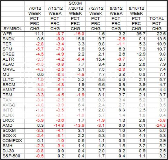 This is a longer 6 week look at the SOXM stocks in terms of percent change.