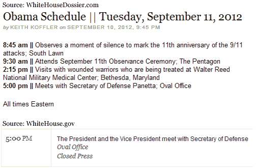 According to the official White House record, Obama, Biden and SECDEF Panetta were meeting approximately one hour after the Benghazi attack began.