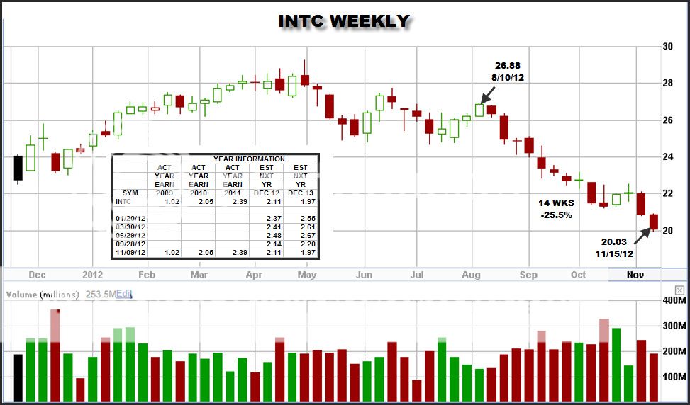 Let's look at the 1 yr weekly chart of INTC and some other tabular data on earnings, both past, present, and future. The chart shows the downtrend of the last 14 weeks. The last red bar shows the results of the first 4 days of this week, and with the results so far, the week results will be down again. Presently, the downtrend is at -25.5 percent.