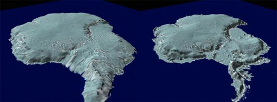 Figure 1: One reconstruction of how the Antarctic Ice Sheet changed from the LGM (left) to present (right), showing up to hundreds of metres of ice thinning. Credit: NASA/Goddard Space Flight Center Scientific Visualization Studio