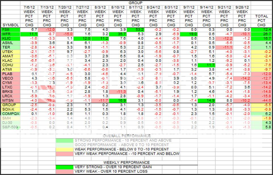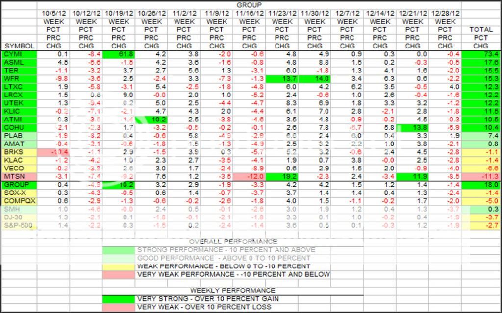 While there is 1 trading day left in this quarter and CY, for all intents and purposes, this is the reading for the last quarter in 2012. The big thing to notice here is the big green number of 18 percent gain for the Group. Most of this was due to the large jump in CYMI evaluation due to their being acquired by ASML announced the week of 10/19. However, many of the stocks did very well over the period. Only MTSN wound up in the red for the 13 weeks.