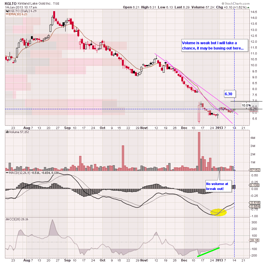 KGI.TO - second candidate. I'm less confident here, I don't see any encouraging volume, but it looks like that it may be basing out here. Target 10%, slightly bellow 7. Entry at 6.30:
