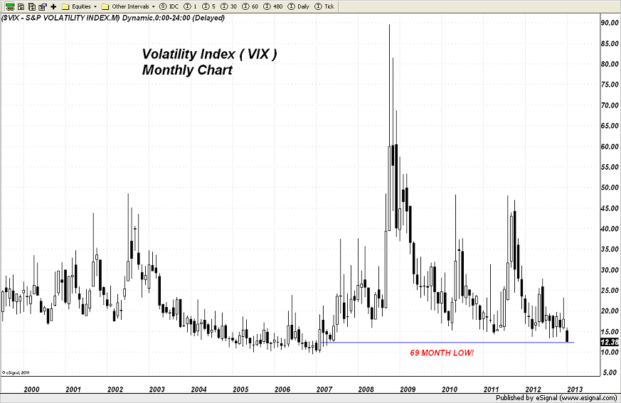 The following chart of the Volatility Index or the VIX as it is more commonly referred to is stunning. With today's further decline, the index has now reached levels last seen in APRIL 2007!  The VIX is a measurement of sentiment. It tends to rise and spike sharply during periods of fear or unease and decline during periods of complacency. What we are basically seeing with today's move is investor complacency is at EXACTLY the same level SIX MONTHS BEFORE THE BOTTOM FELL OUT OF THE US EQUITY MARKETS in late 2007. I remind you that at that time, hardly a bear could be found anywhere with the exception of a few sharp traders/investors, managers who were warning of extreme overvaluations. What is even more interesting (or frightening) is that the S&P 500 was sitting at the EXACT SAME LEVEL back in that month of April 2007 as it is this month, January 2013! Take a look and see.  Want some more mind-numbing news? The S&P 500 is NOW LESS THAN 100 points off its all time high and 85 points off its peak level during what everyone now agrees was a MASSIVE BUBBLE in equities in the year 2000. I must say that based on the current economic conditions, or even expected economic conditions some 6 months out, I find it hard to believe that the current level of the US equity market are rational. That they are sitting at these levels is a testimony to the ability of the US Federal Reserve, the ECB, the BOE and the BOJ to stuff massive and gargantuan amounts of liquidity into the system in order to stave off deflation. Oh yes, they have managed to stave off deflation pressures alright, at least for the time being. What they have done is to create another massive bubble in the equity markets once again. I cannot think of a better poster child to demonstrate the degree to which paper assets can be inflated by meddling Central Bankers than the US equity markets. With bullish sentiment once again at extreme levels, not many bears around, with an economy that continues to crawl along in an "L" shaped recovery, and with no end in sight to the massive US federal budget deficits and overall federal debt, I personally believe that the US equity markets are now a huge accident waiting to happen. Maybe I will be proven wrong for another few months as the economy/market run on these drugs in its system, but I will not be the least bit surprised to see a significant fall in stocks when it does occur. Methinks we are all going to have ringside seats to the greatest experiment in monetary history determining whether or not endless creation of nearly unlimited sums of paper currency can usher in an era of lasting prosperity and effectively do away with any fallout whatsoever from the accumulating of massive indebtedness. One last thing - by the end of the current administration's term, the projected US federal deficit is expected to be in the vicinity of $20 TRILLION. Chew on that for a while and you will see why this market scares the hell out of me, especially with the vast majority of investors utterly complacent with hardly a care in the world. I hope that I, along with you my readers all live long enough to see how monetary historians are going to record this. I suspect they will marvel at the blind folly of so many. It is almost as if an entire generation of investors have lost their collective minds. Remember, as traders, we cannot fight the tape and expect to make money but that does not mean that we cannot marvel at the rank ignorance of our era. traderdannorcini.blogspot.com