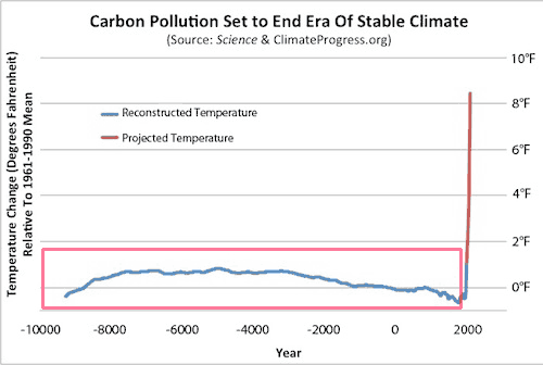 If one converted the temperature scale of the bottom one to degrees Celsius, adjusted the baselines to match and superimposed what is in the red rectangle onto the top drawing, it would be almost indistinguishable from what is there already. In other words, the current global temperature is now about the same as the maximum during the entire Holocene (the area covered by the red rectangle).