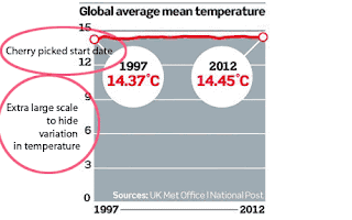 What Watts neglected to point out was that 13 of the hottest 15 years on record occurred since 1997, and all of the 15 hottest years on record were in the period 1995 to 2012 (based on these data from NASA).