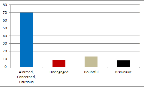 The Yale Group "Six Americas" report collates the six groups as follows: the Alarmed, Concerned and Cautious – currently comprise 70 percent of the American public. Although they range in certainty about the reality and dangers of climate change, they are similarly inclined to believe it is a real threat that should be addressed. Thus, some level of support for action is the predominant view among the majority of Americans. The Doubtful (13%) – the fourth largest group – are uncertain whether global warming is occurring or not, but believe that if it is happening, it is attributable to natural causes, not human activities. They tend to be politically conservative and to hold traditional religious views. The Disengaged (9%) have given the issue of global warming little to no thought. They have no strongly held beliefs about global warming, know little about it, and do not view it as having any personal relevance. They tend to have the lowest education and income levels of the six groups. The smallest audience segment is the Dismissive (8%), who are very certain that global warming is not occurring. Many regard the issue as a hoax and are strongly opposed to action to reduce the threat. About one in nine have contacted an elected representative to argue against action on global warming.