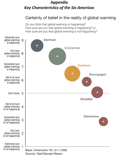 The Dismissives (8%) are the least informed of the lot and prone to conspiracy ideation (global warming is a hoax). Only 10% of this 8% acknowledge the fact that "most scientists think global warming is happening". In fact 17% of the 8% even say they think "most scientists think global warming is not happening". This group has "highly compartmentalised minds" and "profound ethnocentrism" - only mixing with those who share their distorted view of the world.