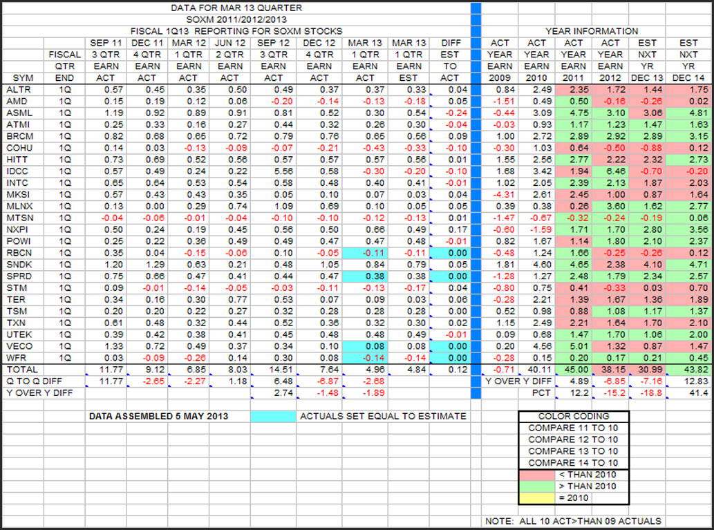 This is an updated tabulation of quarterly earnings for the 24 of 39 SOXM stocks that report on a FY/CY basis.