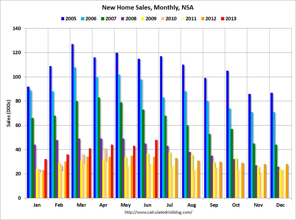 In June 2013 (red column), 48 thousand new homes were sold (NSA). Last year 34 thousand homes were sold in June. The high for June was 115 thousand in 2005, and the low for June was 28 thousand in 2010 and 2011.