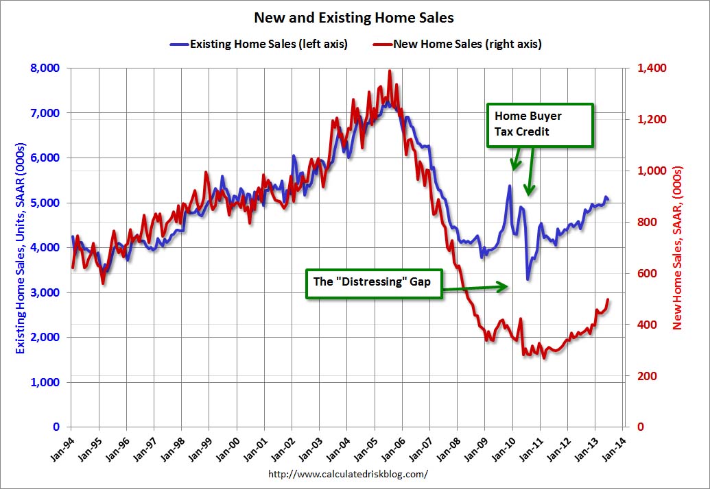 The "distressing gap" graph shows existing home sales (left axis) and new home sales (right axis) through June 2013. This graph starts in 1994, but the relationship has been fairly steady back to the '60s.