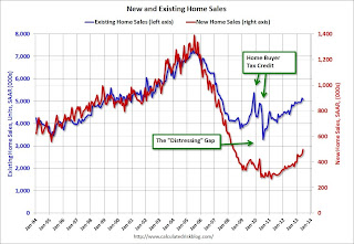 Following the housing bubble and bust, the "distressing gap" appeared mostly because of distressed sales. The flood of distressed sales kept existing home sales elevated, and depressed new home sales since builders weren't able to compete with the low prices of all the foreclosed properties.