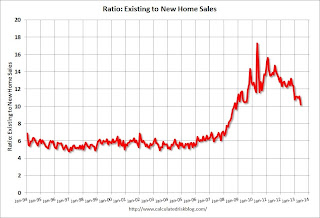 This ratio was fairly stable from 1994 through 2006, and then the flood of distressed sales kept the number of existing home sales elevated and depressed new home sales. (Note: This ratio was fairly stable back to the early '70s, but I only have annual data for the earlier years).