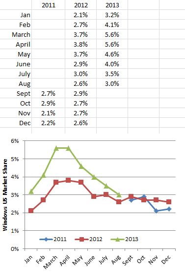 There and Back Again: Kantar's numbers for Windows Market Share in the US and MSFT Continuing to Bang Its Head against the wall.