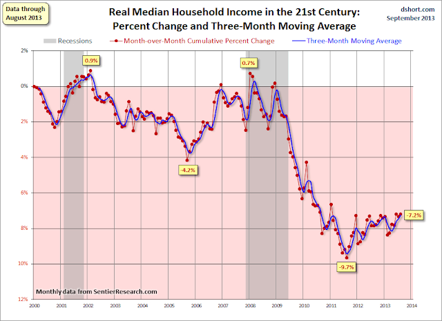 The third chart gives some insight into the true nature of the economic problem. Most of the income gains this century and for the past two or three decades of the past have been flowing to the top few percent of US households. The median household, the middle if you will, has been steadily losing ground in large part to Fed and political policy decisions driven by a mistaken ideology and a top down or trickle down approach to prosperity.