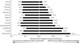 This is now purely economic numbers: nothing about civic engagement and all the rest. It’s after all taxes and benefits, it using PPP (so we have adjusted for price differences between countries) and it’s incomes of the top 10% and bottom 10% compared to the US median income. And we see very much the same story as we do at the top. The US is a much more unequal place than other countries. But notice also that we’re told that the US bottom 10% have a living standard very similar to those of Finland and Denmark: you know, those icy social democracies where they care more about the poor.