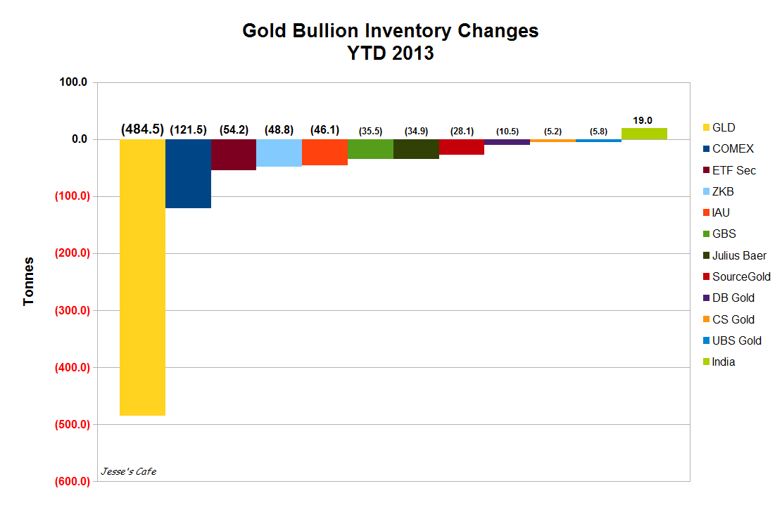 Here is the change, in tonnes, in the inventory of major exchanges and ETFs for gold and silver since the beginning of the year. Nick Laird of Sharelynx.com was kind enough to share the data which he has collected with me. He does a remarkable job in maintaining an enormous amount of data at his site. As you may recall, both silver and gold have seen price declines since the beginning of the year. As a reminder, silver is down 28.7% and gold is down 21.5%. I show this in the last chart. So they have both seen comparably stiff price declines this year. Since the beginning of the year, the major exchanges and ETFs for silver have added about 1,494 tonnes of bullion. But what is absolutely remarkable is that since the beginning of the year the Comex and some of the major ETFs have LOST about 856 tonnes of gold bullion. And I suspect much of that bullion has gone to the non-reporting vaults in Asia and the Mideast. And there is import/export data that corroborates that hypothesis. Now, some might say that they don't see what this means, that they don't see the significance. Or that the significance is that people like silver but don't like gold, even though both have seen price declines, and even though demand for physical gold in Asia and the Mideast has been explosive this year according to trade records. I will tell you what the significance is. The significance is that you are, figuratively speaking, watching water running uphill and out of sight. And some look at this and say, nothing to see here. That gold which is disappearing from the reporting grid will not be coming back to these largely western vaults anytime soon. And it certainly will not be coming back at these prices. It is going into some fairly strong hands with an eye to the long term. Silver is still acting like a precious metal, similar to platinum, which added 21 tonnes, and palladium which added about 1.5 tonnes. Here is what is happening, as shown in the three charts below. Draw your own conclusions. But keep in the mind the negative gold forward rates and record leverage in potential paper claims for physical gold that we are seeing and hearing reported. And this chart does not include the leased gold that is being occasionally disclosed by Western central banks, which seems to be going to satisfy the appetite of Asia. It seems pretty darn obvious to me that there are some big buyers outside this reporting system that are taking down supply, and at a fairly aggressive rate, especially in the last twelve months. You know that I think this exercise was triggered by the revelation that Germany's gold was missing, and a reflexive price manipulation that was intended to dampen demand, but instead set off an avalanche of physical buying. Given that genuinely new gold supply is only added slowly from mining, once the West realizes what is happening the turnaround could take on the character of a short squeeze, and perhaps even a panic and market dislocation to the upside.  And if you are one of those who are holding receipts for gold held in this system, you may find that you have been rehypothecated with extreme prejudice, and given a forced cash settlement at another's discretion. When the time comes your assets may be found to have been used as cannon fodder in the currency war. Thank you for your support. The German people asked for their national gold back, and were told by the Fed to go sit down in the lobby for seven years and wait for it. Are you kidding me? What is it going to take to wake people up that something has gone seriously wrong in these markets? What kind of new fraud or disclosure of fiduciary misbehavior will it take to bring the dawn? And what will happen when the dawn finally comes? Do you wish to be standing in a very long line holding a warehouse receipt or brokerage statement? Good luck with that. You may be a financier, fearing the abyss and hanging on, obsessively doing what worked in the past. But here is some news. You don't have to fall into the abyss, the abyss is coming for you. And the longer this nonsense continues, the worse the drawdowns will become, and the more painful the final reckoning will be. Weighed, and found wanting. Stand and deliver.   |