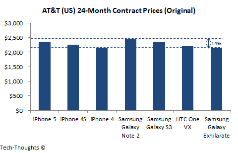 Impact on Premium Smartphone SalesAs I've shown before, US carriers typically conceal smartphone pricing from consumers. This model gave premium smartphones, like the iPhone and Galaxy flagships, an unnaturally high share of the region's smartphone market. AT&T's new pricing model is a stark departure from that -- Compare AT&T's new pricing model (shown in the chart at the top of this post), with their original pricing (shown below):