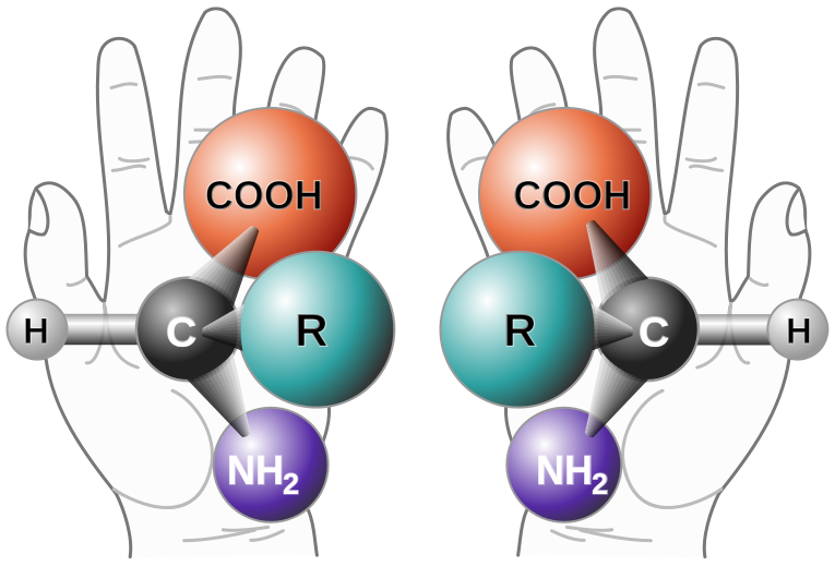 Secondly, amino acids, the workhorses that build proteins, are selected perfectly, too. Amino acids are what are known as "handed," that is they occur in two shapes that mirror each other like a left and right hand. Each of these types is equally distributed in nature: the odds of each are 50% and they will bond to the RNA molecule equally well. But ALL biological proteins must use ONLY left handed amino acids for life to exist. So, how can you have an RNA molecule form randomly but only select the left-handed acids? Given that bacteria are, for e.g., 4 million nucleotides long, how can they assemble by chance to use only left-handed acids?