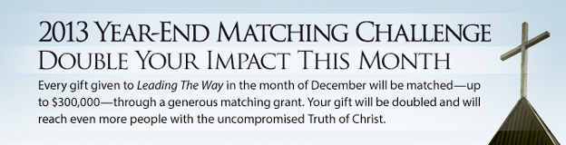 Thank you for your prayers and financial partnership with Leading The Way. He is working through our partnership daily. Will you join us in follow Christ’s lead in 2014 by giving a gift today to Leading The Way? If you do, you will take advantage of our December Matching Challenge, a unique opportunity to give to His work and see your giving doubled. May God be glorified as together we passionately proclaim uncompromising Truth worldwide.
