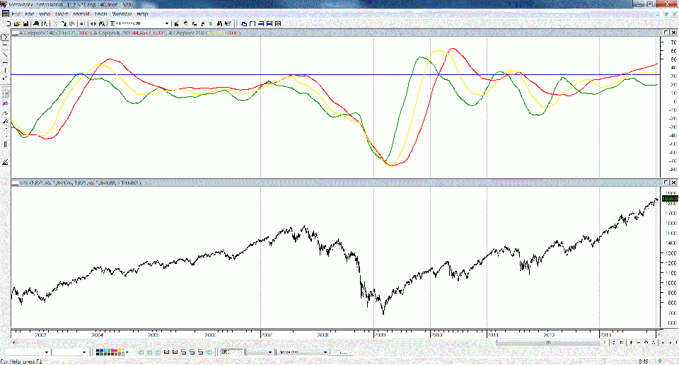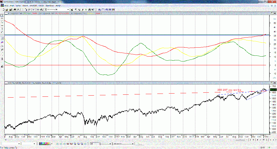 Here's a closer view of the Dow chart. The red 280 day cop is just crawling over the blue line over its high in 2007. The reason to think that there may be follow through is that SPX in the chart below blew through that line in May and keeps chugging up. If the Dow (NYA is similar) continues any higher then we may be in a new up leg with no particular end in sight.