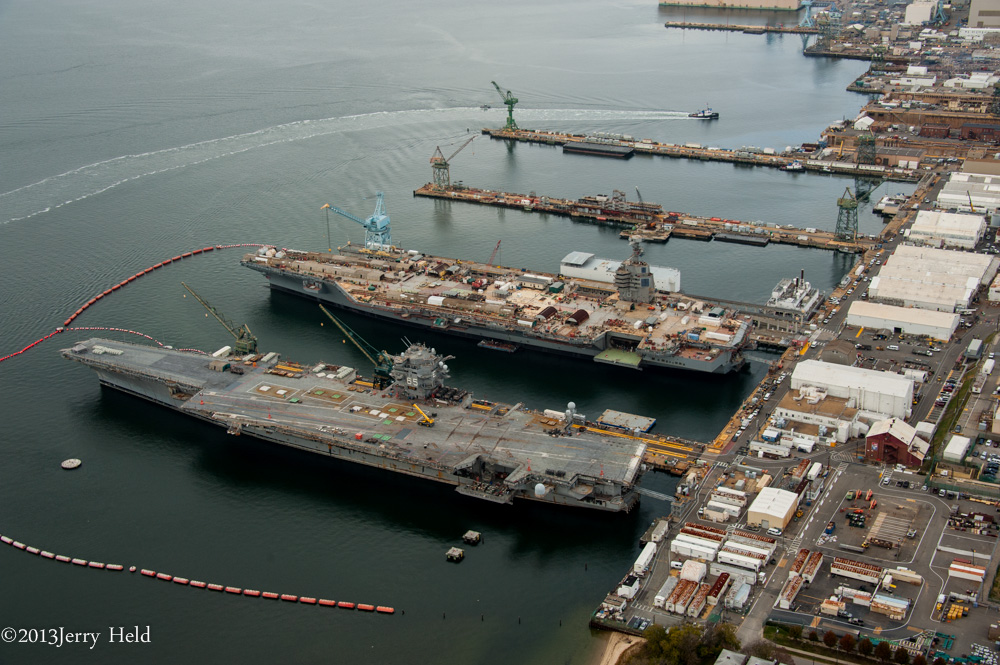 Here is another aerial from last year. This is rather historic in that this is the first nuclear powered aircraft carrier, the Enterprise, (foreground) still the largest navel vessel ever built and now decommissioned, berthed right next to the newest carrier, the Gerald R Ford, newly christened but still a long way from being completed. Docked at Newport News Shipbuilding in Virginia.