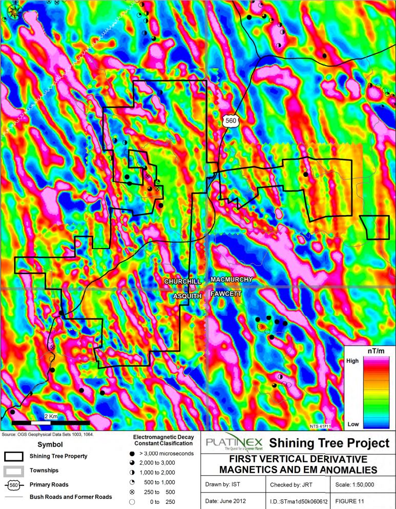 Platinex Shining Tree First Vertical Derivative Magnetics and EM anomalies