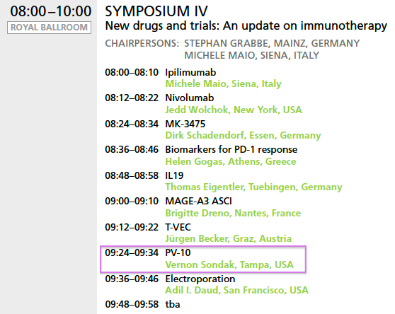 Moffitt Cancer Center's Dr. Vernon Sondak will present PV-10 material on Friday, June 27th at the 4th European Post-Chicago Melanoma/Skin Cancer Meeting in Munich, Germany (see below). Note the company PV-10 will keep in the session: Bristol-Myers Squibb's Yervoy and Nivolumab, Merck's MK-3475, GlaxoSmithKline's MAGE-A3, and Amgen's T-Vec.