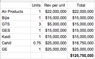 I took a back of the envelope stab at what the annual run rate for revenues could look like when all of these get rolling. There are lots of assumptions but this is not pie in the sky based on my investigations.